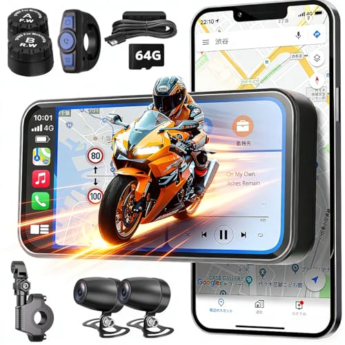 1080Pの前後カメラで高画質録画が可能。CarPlayやAndroid Auto対応でナビ機能が充実し、リアルタイムで交通情報を取得できます。IPX7防水設計で雨天時も安心して使用可能。